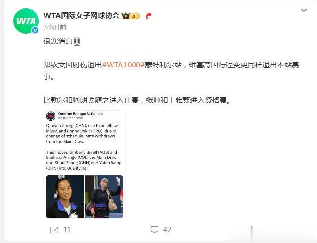 温网之后,郑钦文正本报名插足WTA500华盛顿站、WTA1000蒙特利尔站等赛事,可是在 WTA250汉堡站比赛技能,她因为肘部手术文告退出华盛顿站。而在华盛顿站开赛之际又文告退出蒙特利尔站。期待她的满血转头!